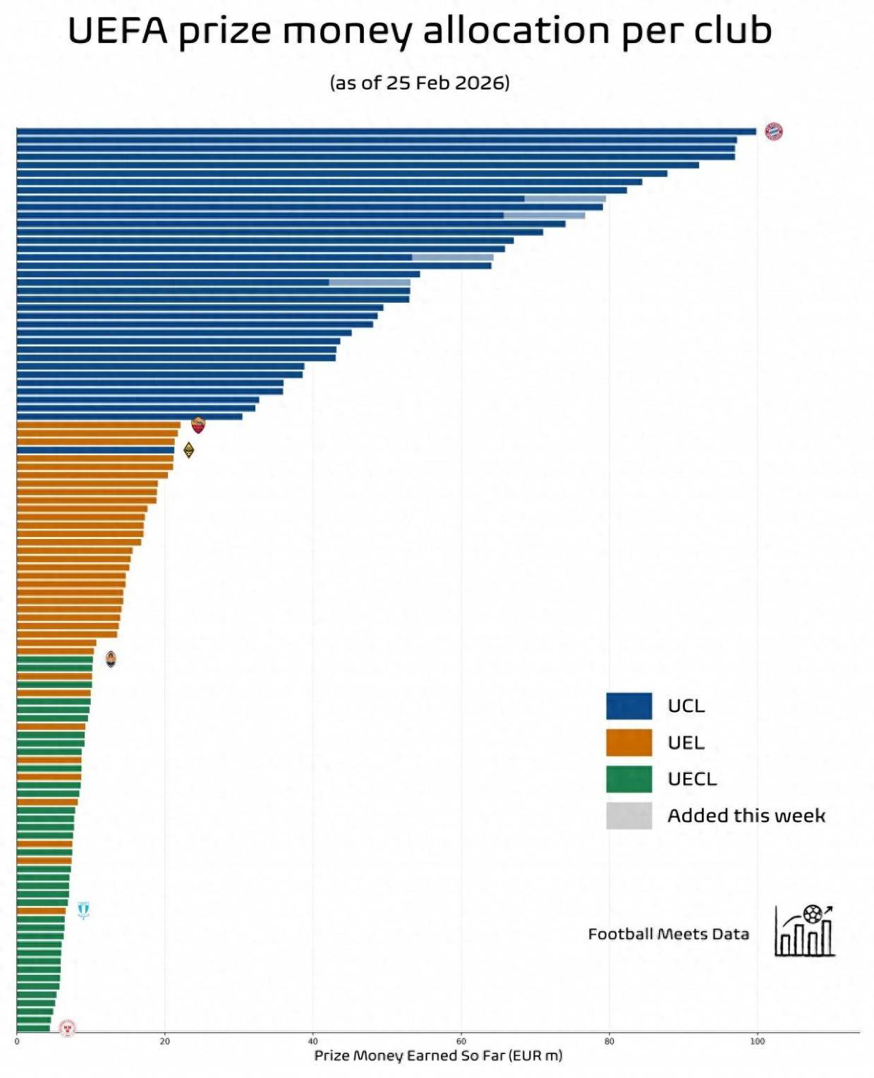 欧冠赛场:奖金最多的是拜仁,9980万欧元;奖金最少的是阿拉木图凯拉特,2120万欧元。 欧联赛场:奖金最多的是罗马,2210万欧元;奖金最少的是马尔默,660万欧元。 欧协联赛场:奖金最多的是顿涅茨克矿工,1030万欧元;奖金最少的是谢尔伯恩,440万欧元。就此可见,获得欧冠正赛资格,躺着也有2000万欧元的收入,拜仁欧冠联赛阶段踢完就等于赚了一个凯恩,怪不得南大王是“大款”。有人问,阿森纳不是全胜战绩吗?为什么欧冠奖金少于拜仁,那是阿森纳的欧战积分不如拜仁,就是近些年厂里不富有的原因,拜仁的欧冠战绩一直非常稳定。