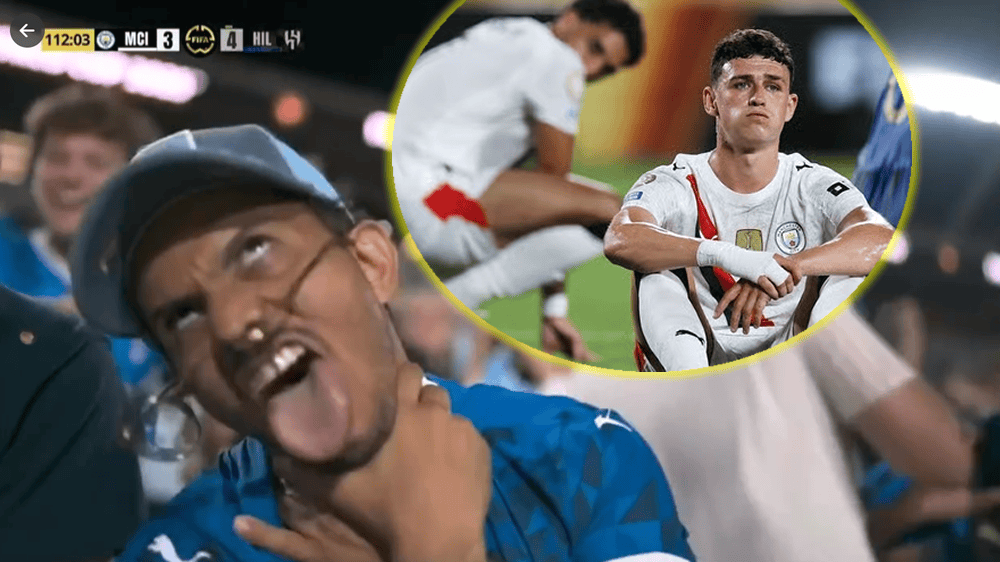 有意思的是,此时直播镜头转向看台上的沙特利雅得球迷,只见一位球迷做出双手掐脖+吐舌头的动作,接着一个歪头,象征着被掐死,以此来嘲讽曼城的输球。